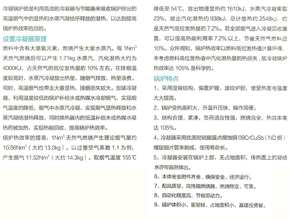 5.冷凝器安裝在鍋爐上部,無占地麵(miàn)積(jī),傳熱麵上的凝結水亦可自然排出。